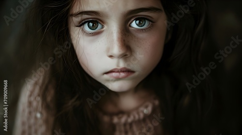 The portrait of the young brunette captured a moment of intense contemplation, the child's eyes wide with fear and her face reflecting deep pensive beauty