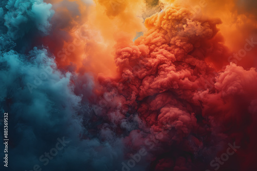 The powerful smoke is a fiery mix of red, yellow, and orange, like a volcanic eruption.