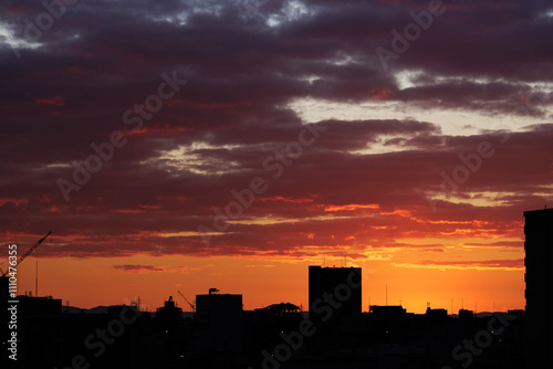 The predawn sky is illuminated by a brilliant orange background, creating fiery hues of blood red orange in the lingering morning clouds as a silhouetted city silently slumbers below.