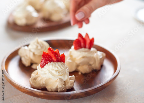 the process of creating Pavlova dessert, decorating the meringue with strawberries