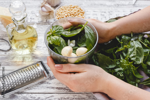 The process of making pesto sauce in a blender from cheese, pine nuts, olive oil, basil, garlic on the white wooden table.