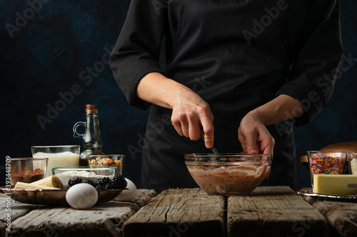 The professional chef kneads dough for preparing waffles on rustic wooden table with ingredients on dark blue background. Backstage of cooking sweet dessert for breakfast. Frozen motion. Good recipe.