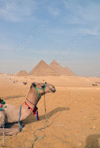 The pyramids at Giza in the desert and camel.