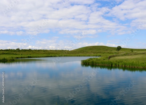lake, water, landscape, sky, nature, summer, blue, green, cloud, tree, cloud, duck pond, grass, spring, outdoors, beautiful, rural, calm, panorama, field, season, seasonal, season, hill, slope, cloudiness, white, sun, light, sunlight, sunny, colours, colours, peaceful, quiet, mirror, background, background, day, daytime, outside