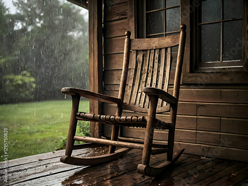 The Rainy Day Rocker: A close-up of an old wooden rocking chair on a covered porch, rain softly falling outside, creating a moody and peaceful atmosphere.
