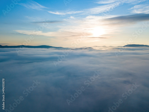 The rays of dawn over the fog in the Ukrainian Carpathians. Aerial drone view.