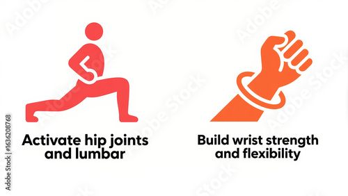The red lunge character and wrist icon represent activating the hip and waist joints, enhancing wrist strength and flexibility, and are used in fitness and joint exercise scenarios.
