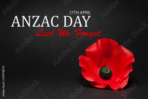 The remembrance poppy - poppy appeal. Poppy flower on black background with text. Decorative flower for Anzac Day in New Zealand, Australia, Canada and Great Britain.