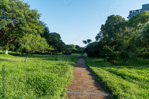 green, park, tree, landscape, lane, grass, city, path, garden, way, nature, summer, road, background, spring, urban, leaf, beautiful, street, plant, natural, walk, lawn, field, paseo, sky, sidewalk, footpath, scenic