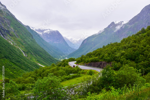 The road running in valley between high mountains with snowy peaks in which Glaciers of Jostedalsbreen National Park is located