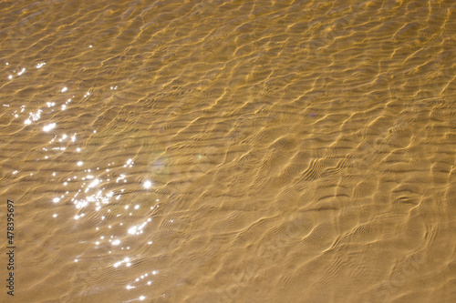 The sandy bottom is yellow, yellow sand under water. The sun rays are reflected on the surface of the water. The texture of the seabed.