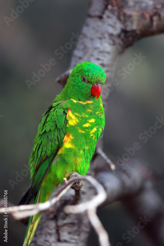 The scaly-breasted lorikeet (Trichoglossus chlorolepidotus) sitting on the branch in the forest. Green parrot on the branch with dark background.
