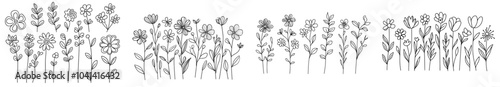 The set of linear flowers are isolated on white background and are hand drawn in ink. Monochrome artistic botanical illustration of anemones, peonies, chrysanthemums.