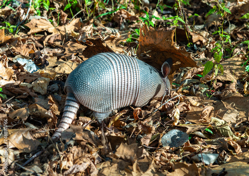 The seven-banded armadillo (Dasypus septemcinctus), animal rummages in a litter of fallen leaves in the forest, Louisiana, USA