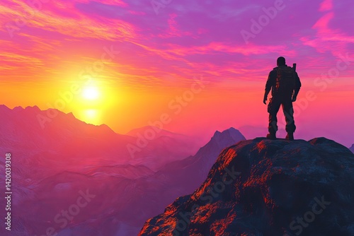 The silhouette of a hiker atop a mountain peak during sunset presents a breathtaking scene with vibrant colors and a beautiful sky
