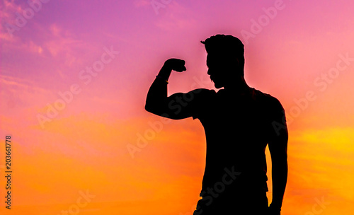 The silhouette of a man, his arms muscles show strong on the background of the sunset. By Phawat