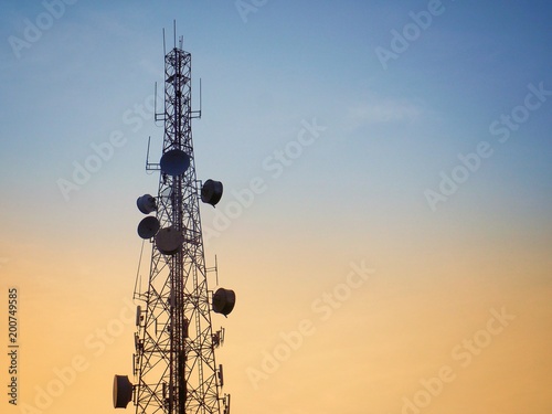 The silhouette of the big antenna in the concept of wireless communication technology from radio waves. Satellite