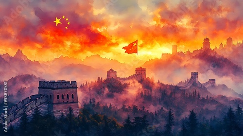 great, wall, china, silhouette, sunset, chinese, flag, diffused, watercolor, sky, warm, evening, light, vibrant, colours, flowing, horizon, national, pride, heritage, peaceful, majestic, scene, hd, soft, texture, iconic, travel, tour tourism, architecture, blending, glowing, scenery