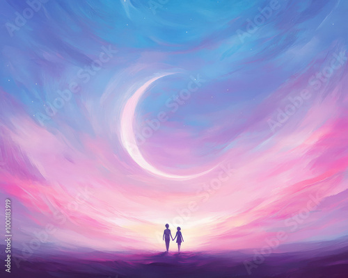 couple, walking, path, field, large, pink, moon, sky, romantic, atmosphere, peaceful, star, night, background, blue, light, nature, beautiful, landscape, space, illustration, abstract, evening, horizon, silhouette, design, dream, bright, full, mysterious, cloud, sunset, fantasy, dark, celestial