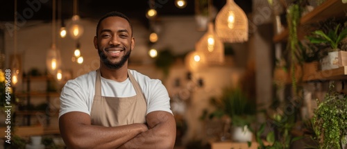 smiling, man, portrait, smile, apron, customer service, plant, interior, cosy, professional, business, lighting, friendly, joyful, ethnicity, happiness, barista, shop, design, cheerful, decor, entrepreneurship, modern, casual attire, lifestyle, standing, ambience, nature, expressiveness, engagement, manpower, occupation, hospitality, greenery, workspace, authentic, photo