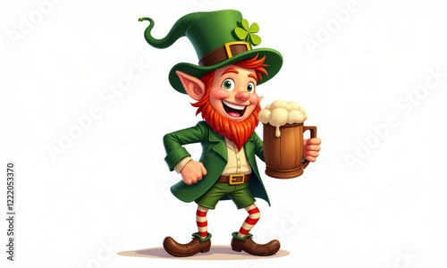 The smiling leprechaun holds a large wooden beer mug and wears a green outfit with red and white striped stockings and an Irish-style hat.