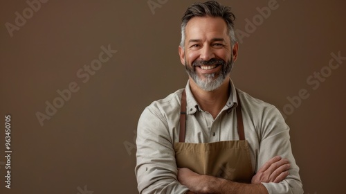 portrait, man, professional, smiling, happy, men at work, confidence, service, food, kitchen, beard, cheerful, male, lifestyle, casual attire, hand, expression, adult, apron, confident, closeup, relaxed, hospitality, mature, background, arm, culinary, friendly, brown, clothes