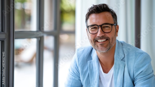 happy, man, portrait, nature, mature, smile, joy, businessman, confident, hair, smiling, face, indoor, lifestyle, light, comfort, casual attire, relaxed, goggles, attractive, beard, modern, blue, morning, eyewear, photogenic, shirt, cheerful, stylish, bright, positive, expression, window, adult, brunette, successful, natural light, content, satisfaction, casual clothes, mid-age, pleased