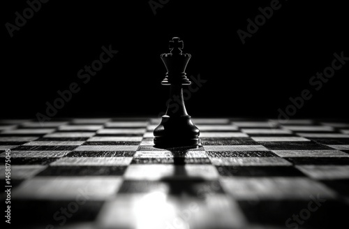 chess, king, piece, board, strategy, game, black, white, chequered, contrast, dark, light, monochrome, play, competition, challenge, intellect, single, alone, isolated, standing, classic, pattern, wood, wooden, table, indoor, studio, shot, art, design, symbol, metaphor, leadership, power, logic, planning, intelligence, minimalism, abstract, geometric, retro, vintage, tournament, sharpened, depth, elegance, nobody, closeup