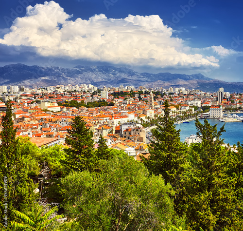The Split waterfront and Marjan hill aerial view, Dalmatia, Croatia