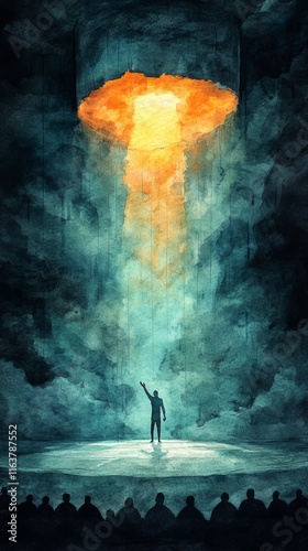 histrionic, personality, disorder, spotlight, stage, attention, symbolic, metaphor, performance, drama, loneliness, craving, audience, isolation, mental, health, exageration, emptiness, fluid, transparent, washes, delicate, subtile, colours, watercolor, style, illustration, mobile, smartphone, portrait, vertical, background, desktop, wallpaper