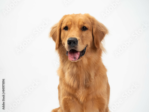 The studio portrait of the puppy dog Golden Retriever with a smile sitting on the white background