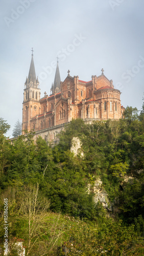 The stunning Basilica of Covadonga, perched on a hillside in the Picos de Europa mountains, enveloped by lush greenery and mist, is a symbol of Spanish religious heritage
