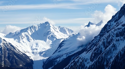 The stunning drama of an avalanche descending a mountain slope, with majestic peaks and chaotic snow, captures an awe-inspiring display of nature in motion.
