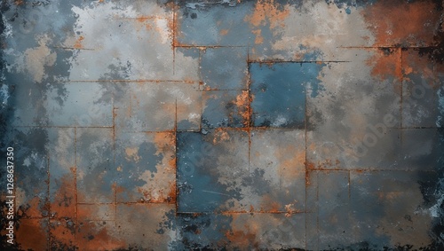 The style is reminiscent of a rustic, industrial aesthetic with a mix of muted colors, primarily shades of gray and blue, interspersed with subtle hints of rust and brown.