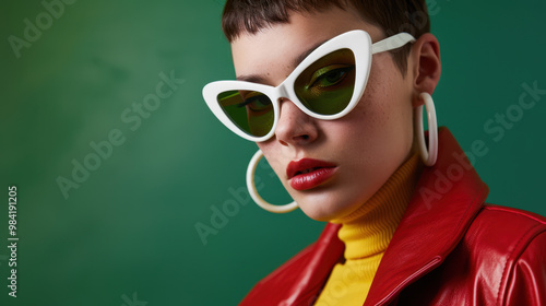 fashion, style, portrait, model, sunglasses, accessory, beauty, colours, vibrant, glam, lipstick, make-up, retro, chic, trend, creative, young, urban, confident, modern, striking, green, attitude, elegance, showy, head shot, photo, studio, editorial, artistic, contemporary