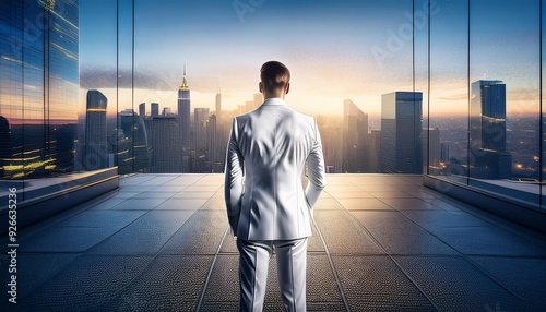 The Successful Businessman Standing Tall in a White Suit, Embracing the Abstract Concept of Leadership, with a View of the Skyline