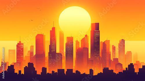 The sun sets behind futuristic skyscrapers enveloped in an orange glow, casting a dreamlike ambiance over the modern cityscape. Dreamlike - Castle. Illustration