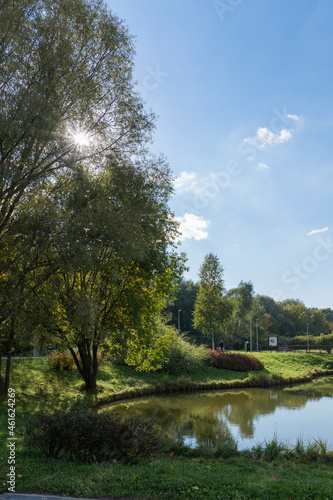 autumn, city park, yellow leaf, landscape, park, leaf, foliage, forest, nature, life, biosphere, leisure, weekend, walk, vacation, hobby, season, day, outdoors, sun, light, lawn, tree, view, beautiful, colourful, green, yellow, sky, blue, cloud, environment, travel, city, urban, bright, colours, natural, water, duck pond, lake, body of water, shore, river