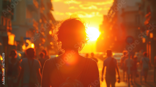 the sunset on the background of the metropolis. Silhouette of a man during heat wave