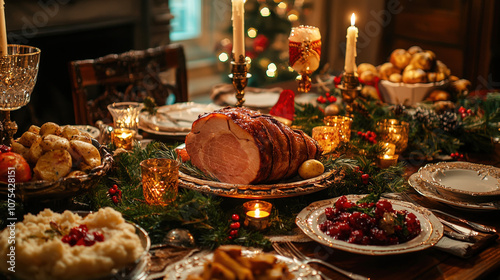 holiday, feast, dinner, table, roasted, ham, christmas, decoration, candle, side, dish, festive, celebration, family, gathering, food, winter, dining, greenery, seasonal, ornament, plate, gourd, dessert, drink, warmth, joy, togetherness, tableware, party, tradition, culinary, gathering, hospitality, twinkling, market, buffet, sweet, delicious, fruit, candle, eatery, meat, cake, salad, decoration, meal, christmas, party
