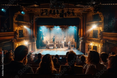 theatre, stage, actor, performance, audience, costume, vintage, show, evening, dramatic, lighting, entertainment, play, live, spectator, cultural, event, drama, art, design, storytelling, sound, applause, emotion, expression, historical, theatrical, art, narrative, engagement, space, set, creative, function, community, performing, generative, ai