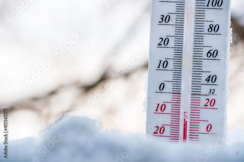 The thermometer lies on the snow in winter showing a negative temperature. Meteorological conditions in a harsh climate in winter with low air and ambient temperatures.Freeze in wintertime