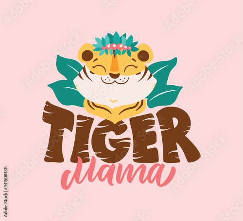 face, head, tiger, mother, mother, wild, mother, logotype, logotype, leaf, smile, cartoon, flat, cute, design, vintage, art, graphic, fun, apparel, lettering, text, phrase, quote, image, vector, illustration