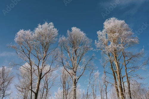 The tops of trees covered with hoarfrost against the blue sky