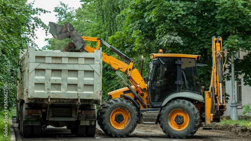 the tractor empties the earth into the body of the dump truck