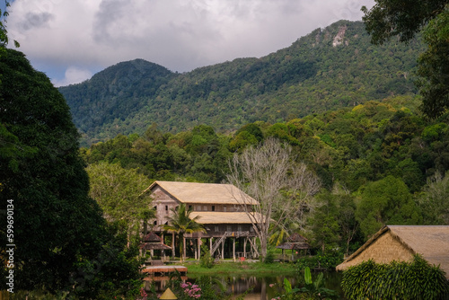 The traditional heritage Melanau tall house with the blue sky, rainforest landscape, and mountain in Sarawak, Malaysia.