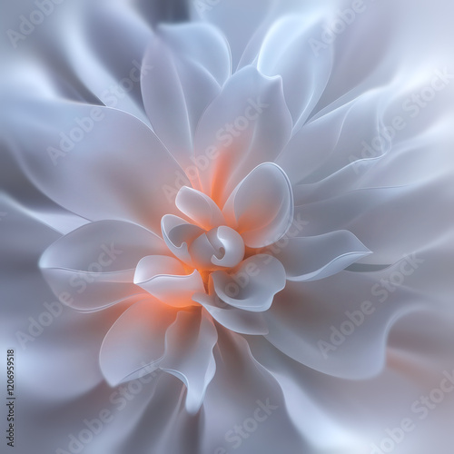The translucent white petals of the abstract flower gently curve around the bright orange light, creating a sense of lightness and organicism in futuristic minimalism