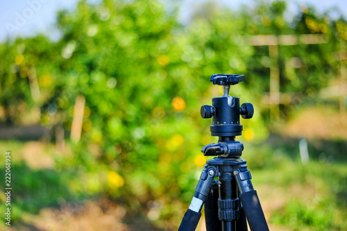 The tripod is located in a green area. Located in the orange garden. For the filming in the orange garden.
