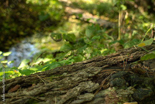 The trunk of a fallen pine tree in the forest