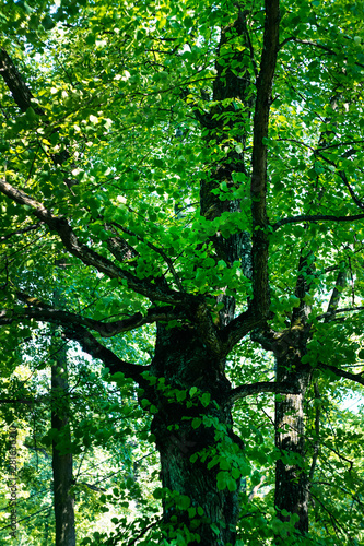 the trunk of an old Linden trees and green foliage
